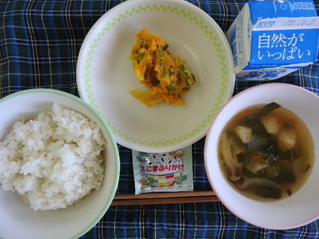 本日のメニューは、麦ごはん、鶏だんごのみぞれスープ、かぼちゃとチーズのサラダ、ふりかけ、牛乳 597㎉ タンパク質18.0g 感謝