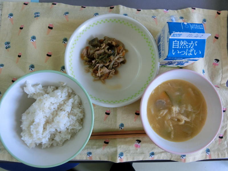 今日の給食は、麦ごはん、みそ汁、なすの中華いため、牛乳(570カロリー、たんぱく質19.1g)でした。とてもおいしくいただきました。
