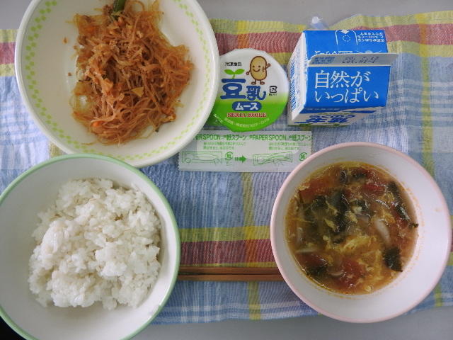 本日のメニューは、麦ごはん、モロヘイヤとトマトのスープ、麻婆春雨、デザート、牛乳 638㎉