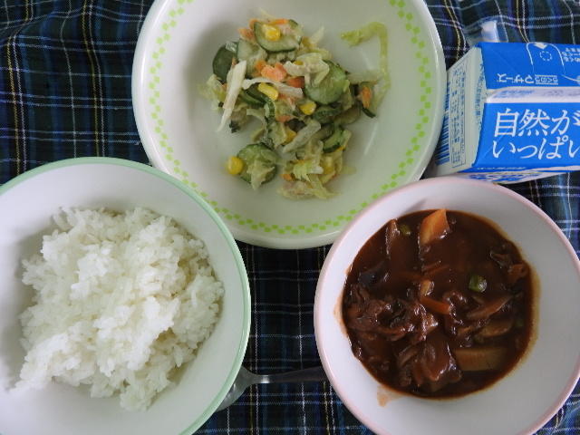 本日のメニューは、(子どもも大人も大好き)カレーライス、みそドレッシングサラダ、牛乳 636㎉ タンパク質20.3g 感謝!