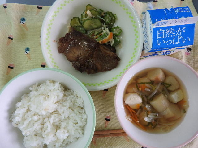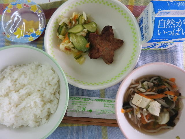 本日のメニューは、ごはん、天の川汁、星形ハンバーグ、みそドレッシングサラダ、七夕ゼリー、牛乳 652㎉ タンパク質22.6g 天の川汁は、七夕の行事食だそうです。七夕には、天の川に見立てた「そうめん」を食べる習慣があるそうです。(食育だより 7月号より抜粋)