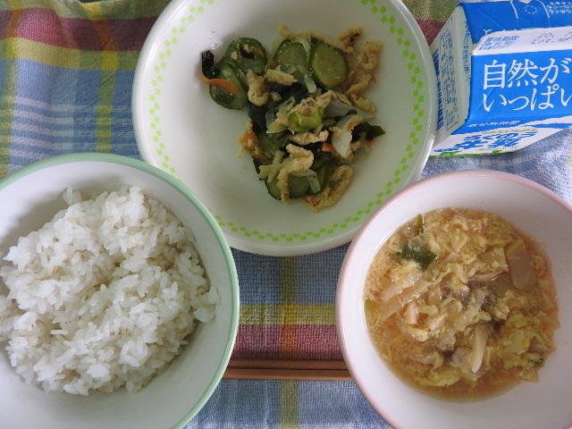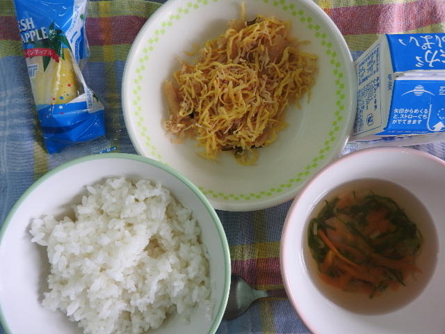 今日のメニューは、ごはん、くきわかめスープ、ぶたあえ、レンコンチップス、牛乳(609カロリー、たんぱく質22.8g)でした。今日もおいしくいただきました。ごちそうさまでした。