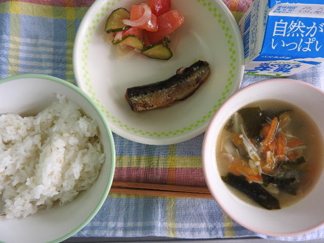 今日のメニューは、麦ごはん、とうがんのみそ汁、いわしのかぼすレモン煮、トマトの甘酢、牛乳 589㎉ タンパク質20.8g 今日も感謝しながらいただきました。