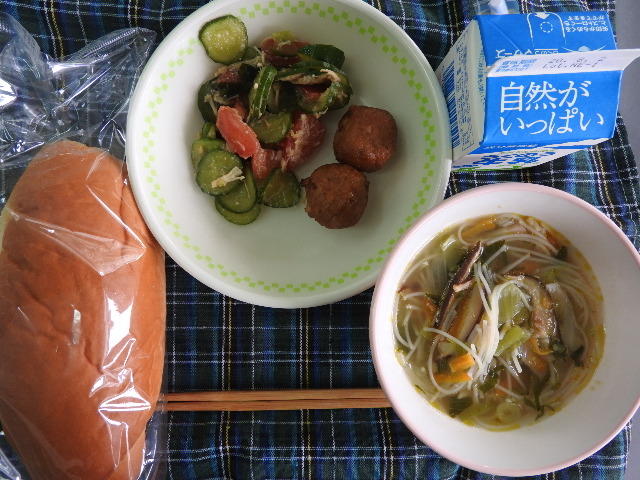 今日のメニューは、ミルクパン、牛乳、汁ビーフン、とりだんご、バンバンジーサラダ 714㎉ タンパク質31.1g 感謝!(月曜日はカレーうどん!)