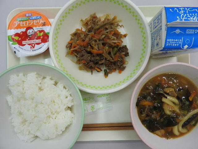 今日のメニューは、ごはん、カレーうどん、牛肉のしぐれ煮、アセロラゼリー、牛乳 655㎉、タンパク質22.0g 毎日、おいしくいただいています。感謝!