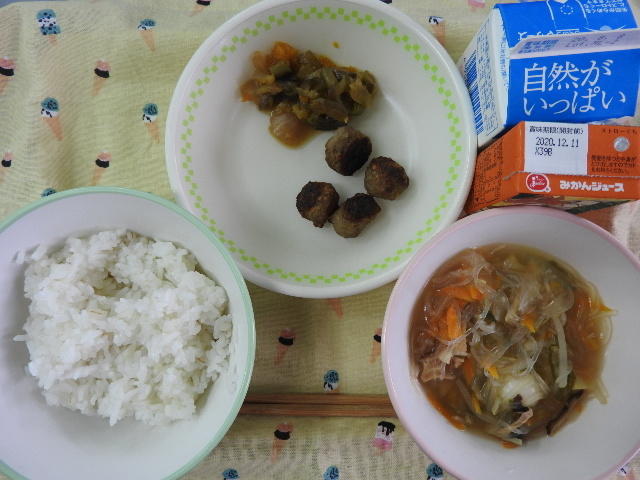 今日のメニューは、麦ごはん、五目春雨スープ、ミートボールと南関野菜の甘酢あえ、牛乳、オレンジジュース 698㎉ タンパク質20.4g