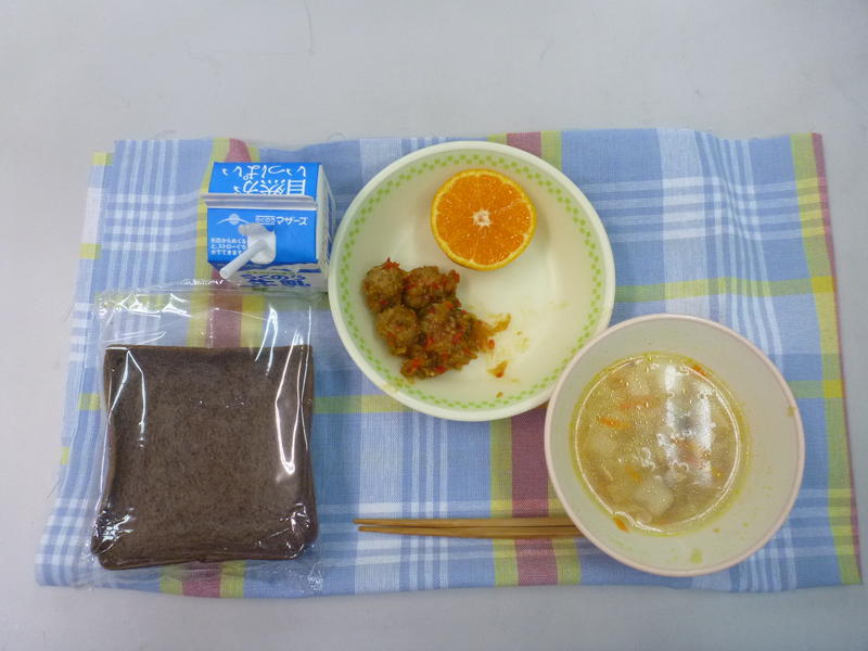 ココアパン ベーコンとかぶのスープ ミートボールのケチャップあえ みかん 牛乳