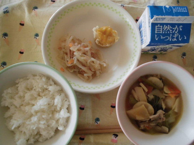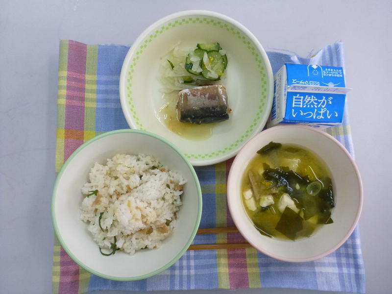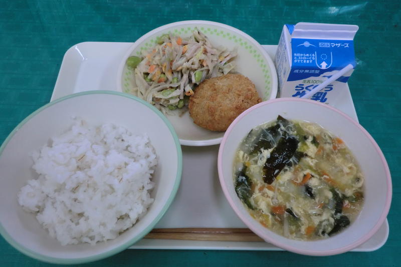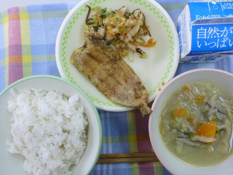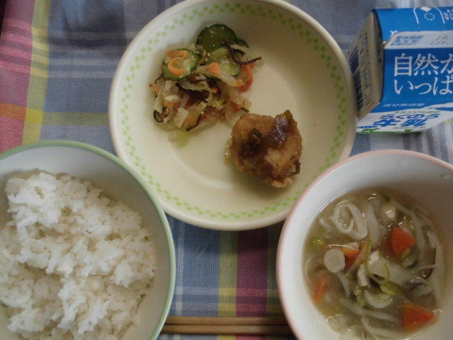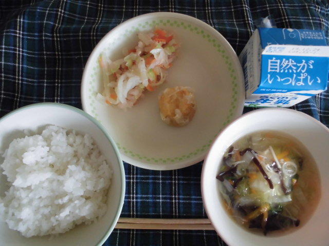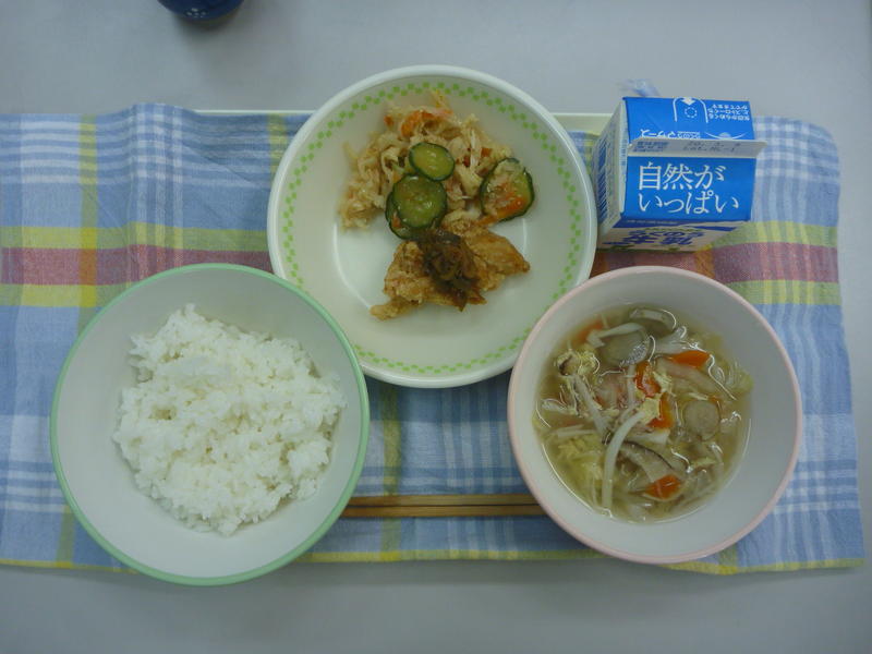今日の給食は、ごはん、節そうめん入り卵スープ、チキンのねぎソース、白酢あえ、牛乳でした。今日は、「南関そうめんの節」を使った卵スープでした。とてもおいしくいただきました。