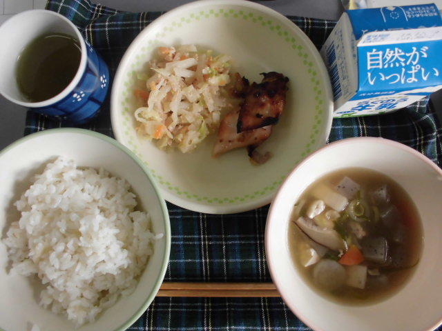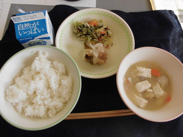 本日のメニューは、ごはん、,味噌汁、チキン南蛮、キャベツの浅漬け、牛乳でした。出張が続き、3日ぶりの給食でした。感謝!