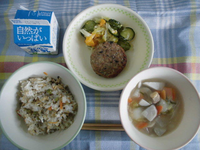 今日はくまさんデーのメニューです。びりんめし、白玉だんご汁、いわしとお肉のハンバーグ、みかんサラダ、牛乳 617㎉、タンパク質は23gです。びりんめしは、宇城市三角町戸馳地区の郷土料理です。