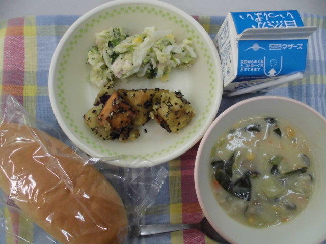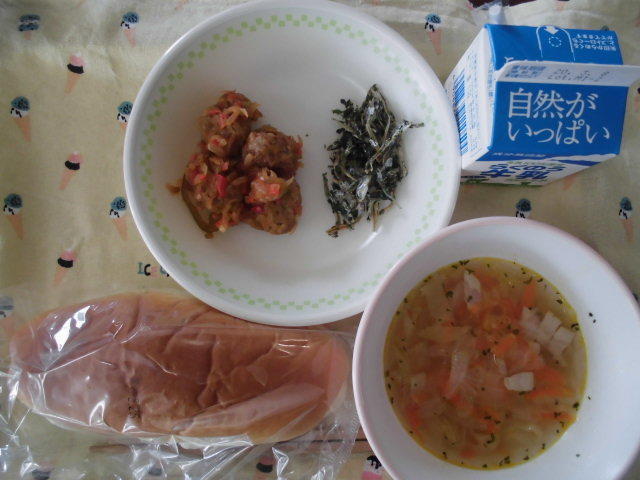 本日のメニューは、ミルクパン、牛乳、野菜とベーコンのスープ、ミートボールのケチャップ和え、いりこの青のりあえ 606㎉ タンパク質24.0g