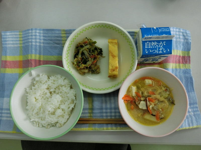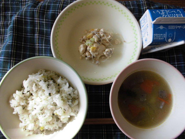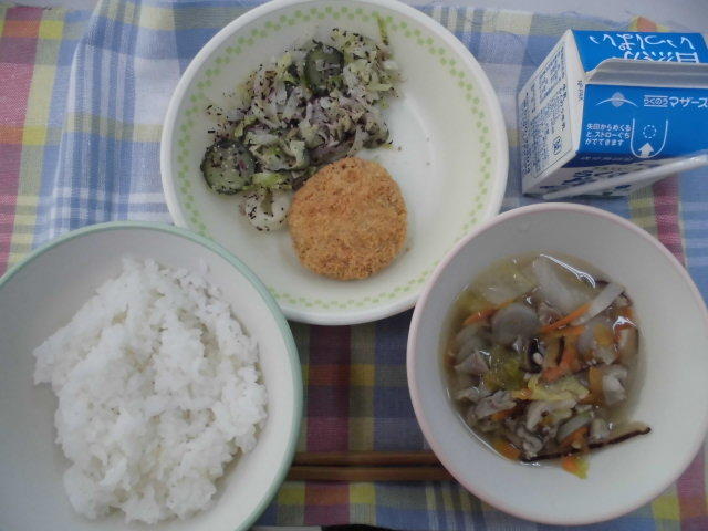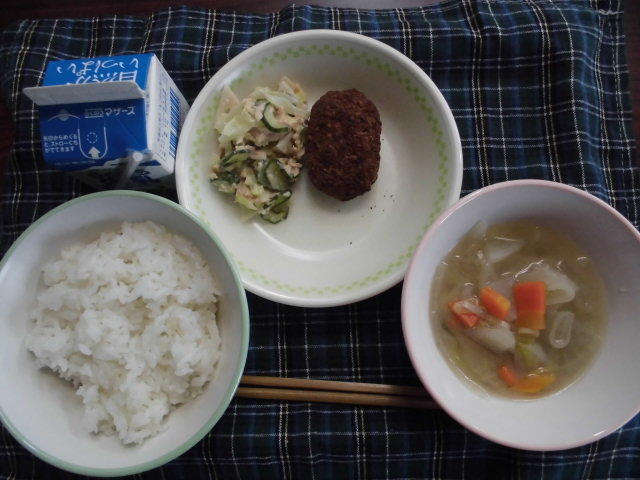 ごはん、牛乳、豚肉と白菜の味噌汁、彩り野菜のミンチカツ、ゆかりあえ、611㎉、タンパク質19.8g 午後から四小の研究発表会があり、町内の各学校の給食の時間が早くなりました。センターの皆様には、調理等大変だったかと思います。ありがとうございました。感謝!