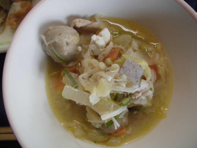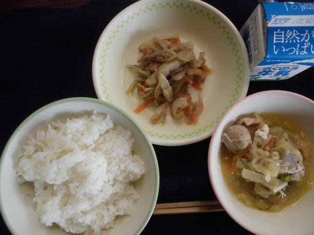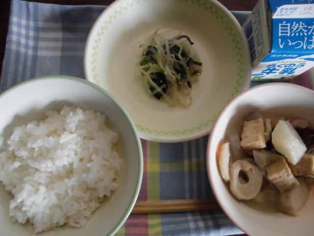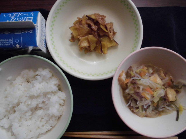 ごはん、武光公鍋(たけみつこうなべ)、きんぴら、牛乳 597㎉ タンパク質23g