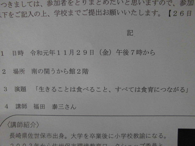 11月18日付けでご案内の文書をお届けしましたとおり、11月29日(金)19時より、南の関うから館にて講演会が開催されます。演題は「生きることは食べること、すべては食育につながる」です。まだ申込可能ですので、参加のほどよろしくお願いいたします。