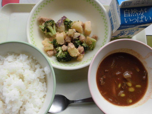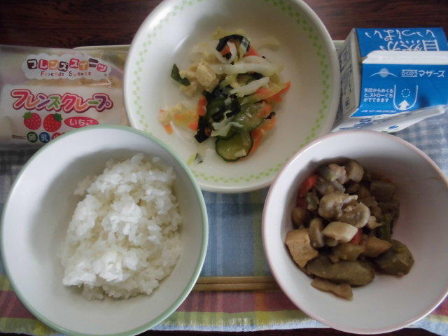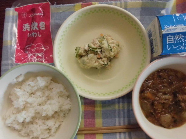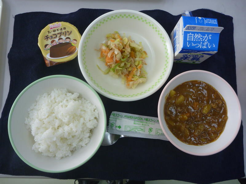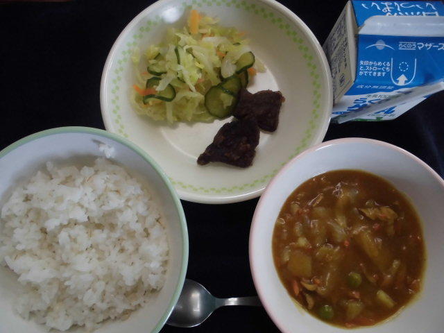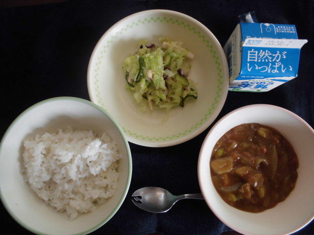 今日の給食は、ビーフカレー、大根サラダ、デザート、牛乳でした。カレーには、隠し味としてリンゴが入っていました。今日もおいしくいただきました。