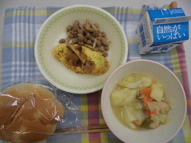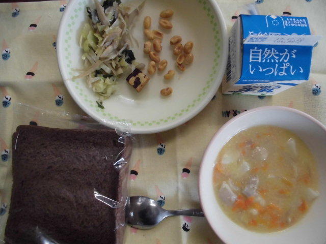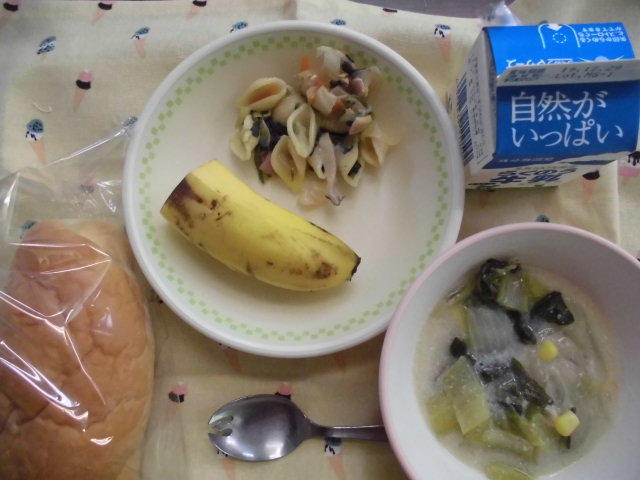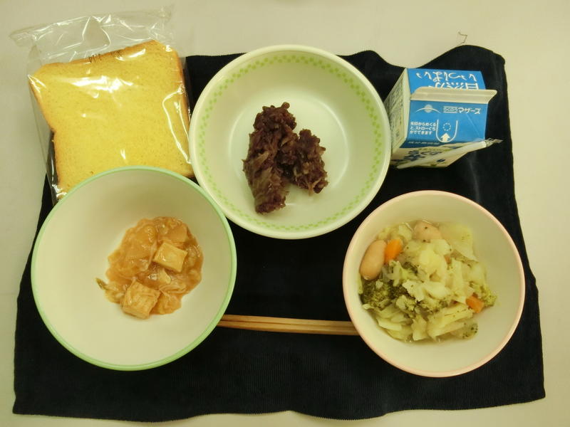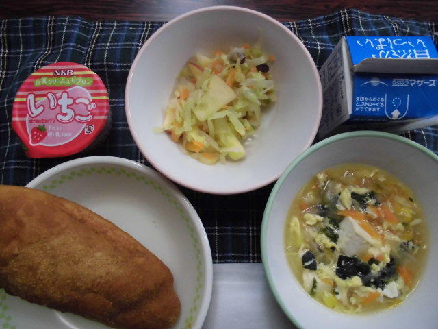 今日の献立は、ごはん、魚のオーロラソース、白菜とリンゴのサラダ、豆のスープ、牛乳でした。「豆のスープ」には、「レンズ豆」という珍しい豆が入っていました。レンズの形に似ているところから名前が付いたのかもしれません。今日もおいしくいただきました。