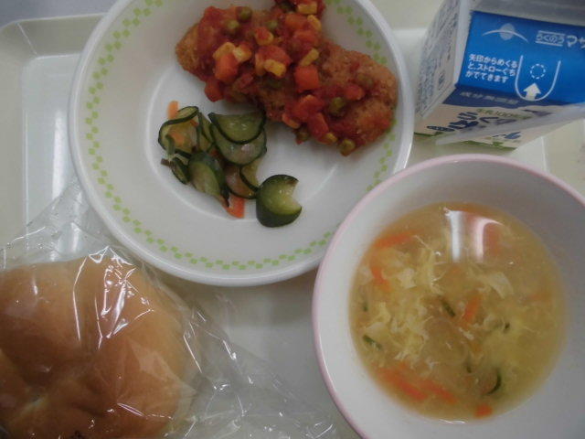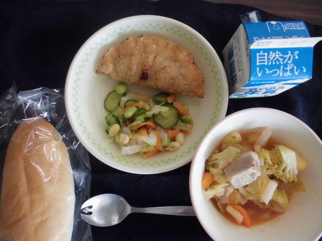 本日のメニューは、「くまさんデー」により、「八代地区の献立」です。ひのくにパン、ブルーベリージャム、コーンとたまごスープ、魚のはちべえソースかけ、きゅうりと生姜の和え物 634㎉ タンパク質23.9g 八代地区の献立なので、はちべえトマトを使ったソースが使われたのでしょう。