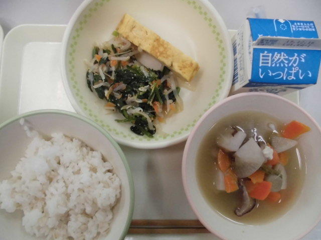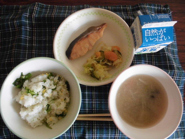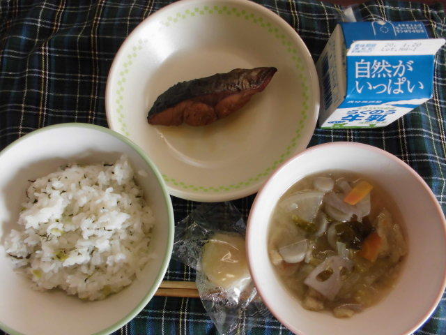 本日のメニューは、大根菜めし、さつま汁、いりどうふ、牛乳 604㎉ タンパク質21g