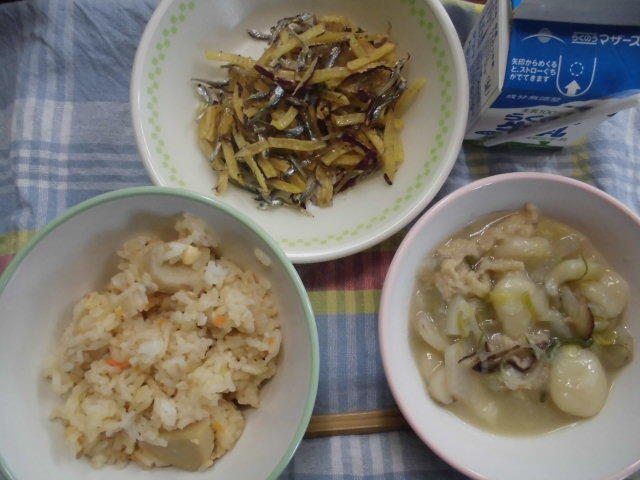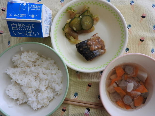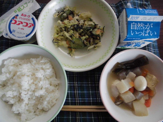 今日の給食は、つなひきよいしょ(ごはん)、おひめさんだんご汁、いわしの生姜煮、五分漬け、牛乳 617㎉ タンパク質22.3g