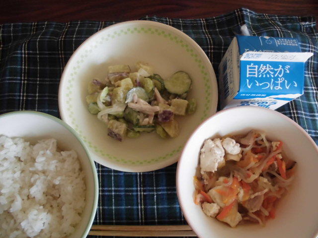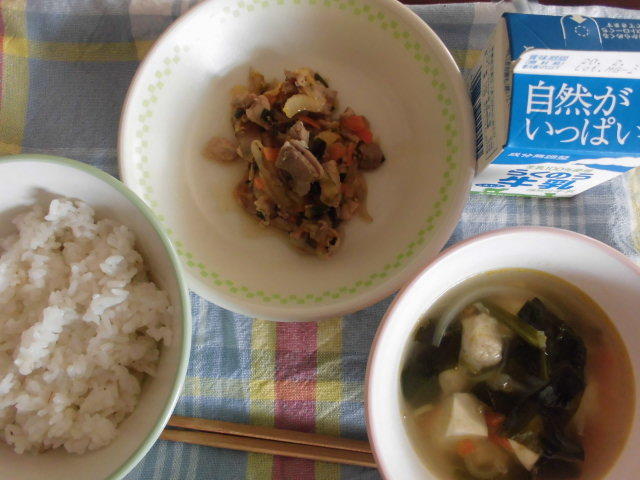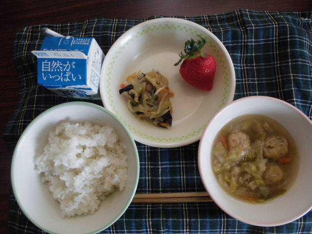 今日のメニューは、麦ごはん、根菜団子汁、節そうめんの炒め物、いちご、牛乳 583㎉ タンパク質19.5g いつもですが、今日もおいしかったです。感謝!