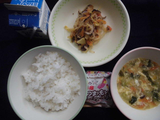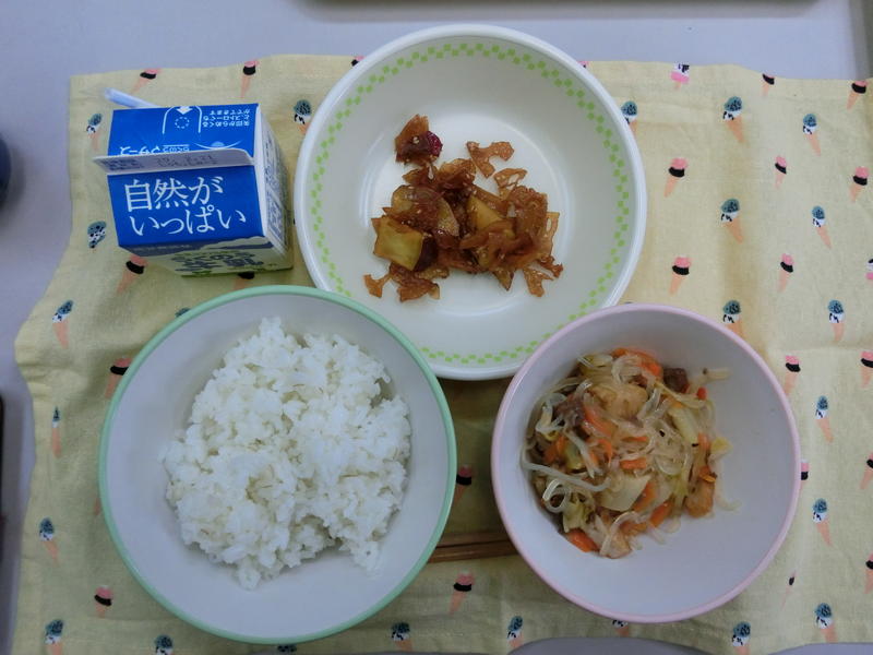今日の給食は、麦ごはん、チンゲンサイと卵のスープ、チェプチェ、デザート、牛乳 683㎉ タンパク質20.9g 感謝! チェプチェ(春雨を炒めた韓国料理)