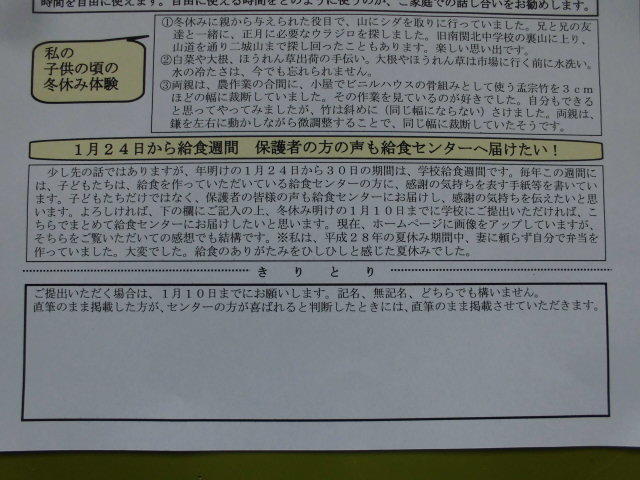 お願いです。年末の12月17日に発行しました学校便り「南一の風」の、タイトル「1月24日から給食週間 保護者の方の声も給食センターへ届けたい」(下の画像)について、感想等がありましたら、学校までご提出いただくとありがたいです。