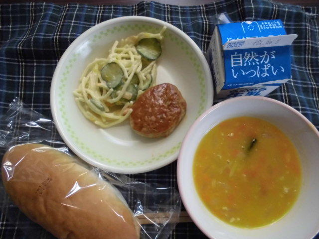 今日のメニューは、コッペパン、にんじんとかぼちゃのスープ、ハンバーグデミソース、スパゲティサラダ、牛乳 603㎉ タンパク質22.7g
