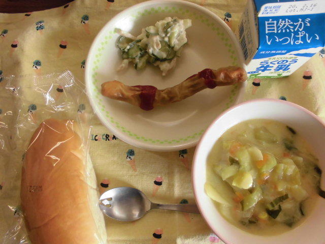 本日のメニューは、コッペパン、牛乳、白菜のクリーム煮、ウインナーケチャップ、ポテトサラダ 609㎉ タンパク質25.2g 今日もおいしくいただきました。感謝!