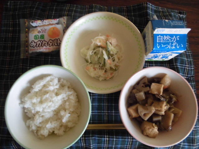 本日のメニューは、麦ごはん、てっか煮、春雨サラダ、デザート(国産みかんタルト)、牛乳 734㎉ タンパク質22.7g(てっか煮は、筑前煮に似ていました。画像があるので、説明は不要でしたね。)