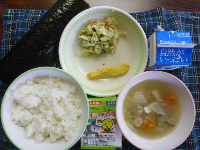 本日のメニューは、セルフ手巻きずし(手巻きの具:納豆、卵焼き、ツナのごまあえ)根菜つみれ汁、牛乳 653㎉ タンパク質26.3g 海苔は、熊本県漁業組合から提供していただいたものだそうです。給食に感謝!給食センターの皆様、漁協様に感謝!