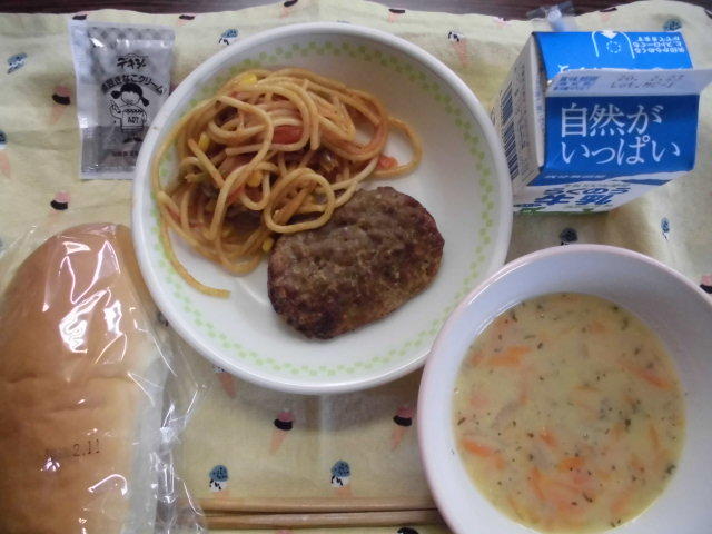 本日のメニューは、コッペパン、黒豆きなこクリーム、牛乳、にんじんポタージュ、国産ミートハンバーグ、ナポリタン 621㎉ タンパク質23.5g 感謝