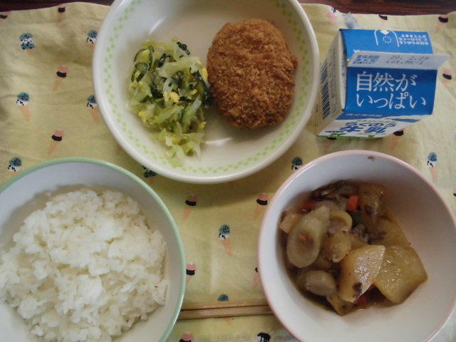 今日のメニューは、ごはん、牛肉と大根のべっこう煮、うまかコロッケ、菜の花サラダ、牛乳 736㎉ タンパク質23.8g