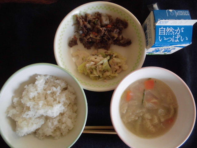 本日のメニューは、麦ごはん、ごま汁、牛肉のしぐれ煮、ツナサラダ、牛乳 652㎉ タンパク質23.9g しぐれ煮は生姜を加えた佃煮だそうです。(献立予定表 ひとくちメモより)感謝。