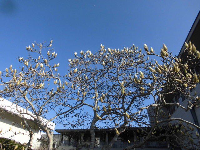 画像は、昨年よりも2~3週間早く膨らみ始めた正門横のハクモクレンです。