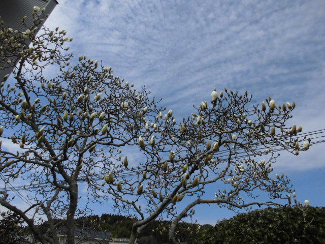 画像は、昨日よりもさらにつぼみがふくらんだハクモクレンです。