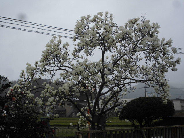 画像は、本日のハクモクレンです。雨にうたれても綺麗に咲いてくれています。