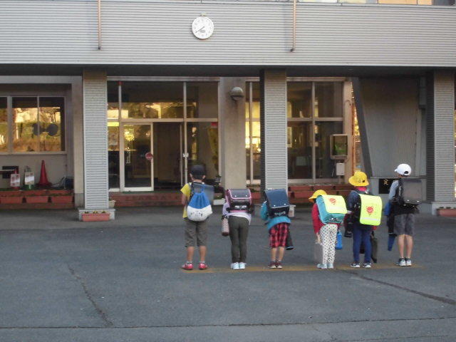 1年生が初めて登校する初日の朝は晴天となりました。登校班の班長さんたちの言うことを聞いて、一列で登校していました。学校に着いたら、校舎に向かっての挨拶の仕方を上級生から教えてもらい、元気に挨拶をしてくれました。