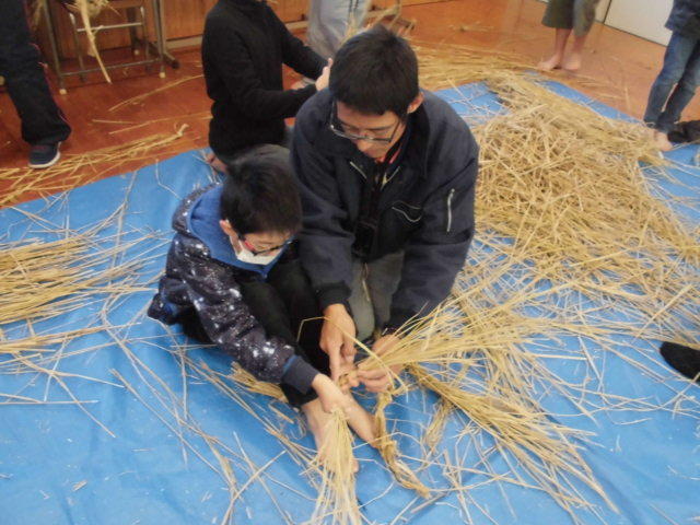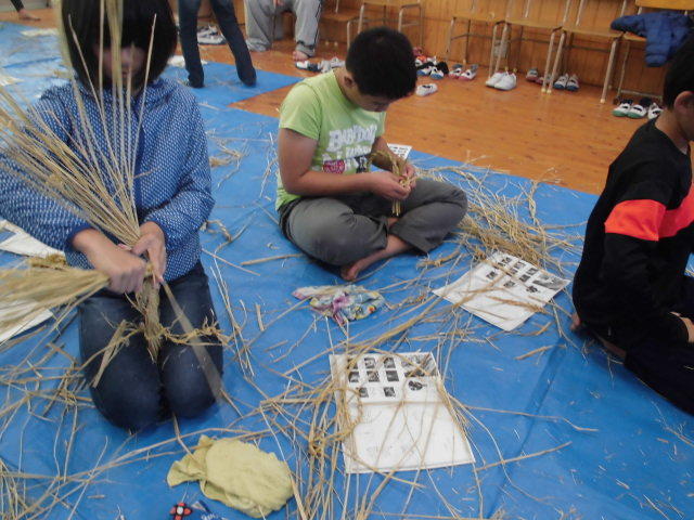稗島さんをGT(ゲストティーチャー)としてお迎えし、5年生がしめ縄作りを体験しました。わらを使って縄をなうのは難しい技ですが、苦戦しながらもしめ縄を仕上げることができました。