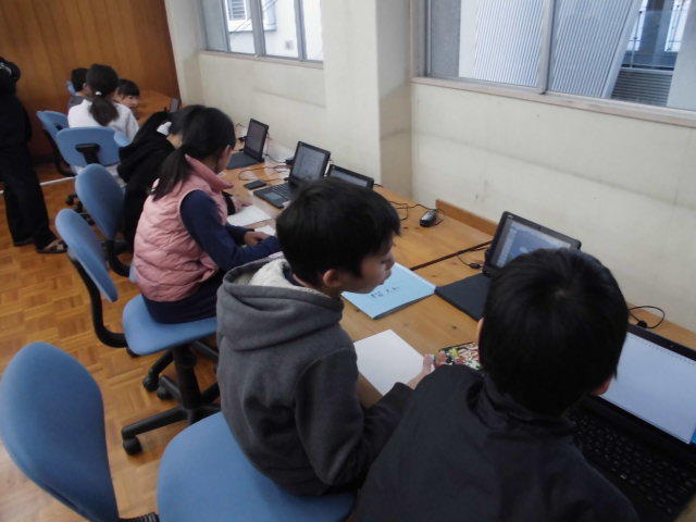 1時間目に、4年生が社会科などで学んだことを学習成果発表会で発表するときに使用するプレゼンテーション資料をパソコンで作成していました。課題ごとにグループをつくり、分担して作成していました。見る人に伝わることを意識(相手意識)して、より効果的な資料づくりのために、話し合いながら作成を進めていました。