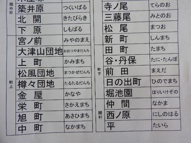 先日、一小校区の地区名をお知らせしましたが、関村地区の「坊田(ぼうだ)」地区が掲載されていないというご指摘をいただきました。謹んでお詫び申し上げます。他にも漏れがございましたら、ご連絡いただきますようよろしくお願い申し上げます。