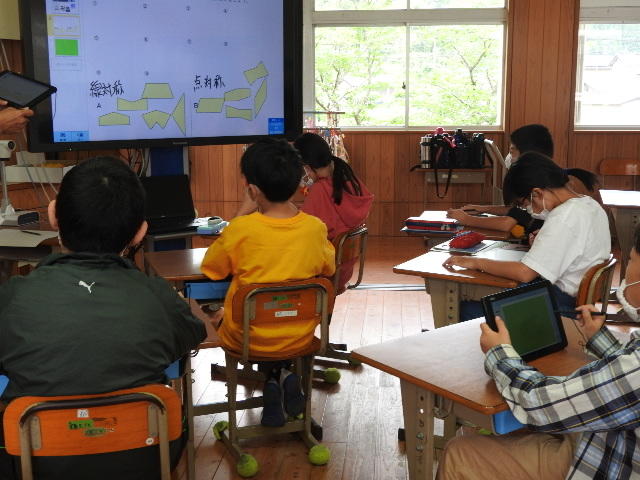 画像が分かりにくいですが、左から2番目の子どもがタブレットを操作して、点対称な図形を描いています。すると、教室の電子黒板に、タブレットの画面(点対称な形を描いている)が映し出されます。