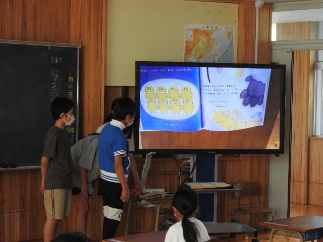 書画カメラを使って電子黒板で絵本を映し出しながら
