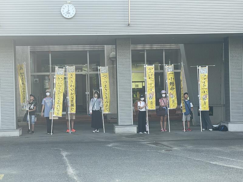 今朝は、総務委員のみんながのぼり旗を持ってあいさつ運動を行ってくれました。