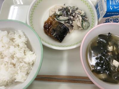 今日の魚はさばです。秋から冬にかけて脂がのり、おいしい季節です。その時期のさばは、「秋さば」ともいいます。みなさんは、魚屋さんで魚をみて、どの魚がさばかわかりますか?さばは、歯が小さいことと、背中の模様が特徴です。さばは、主にからだをつくる働きがあります。そのほかにも血をさらさらにしてくれたり、頭の働きをよくしてくれる脂質が入っています。