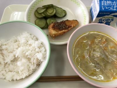 今日のメニューは、麦ご飯、牛乳、たまごスープ、なすの肉味噌、きゅうりの梅肉あえです。