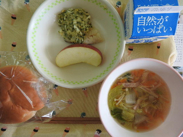 今日のメニューは、米粉入りかぼちゃパン、牛乳、ベーコンとかぶのスープ、ミートボールのケチャップ和え、いりことナッツの豆乳和え 636㎉ タンパク質25.7g 今日のメニューは、それぞれのメニューの名称が凝っているなあと、感じました。でも、名称とは関係なく、いつものように感謝しながら美味しくいただきました。