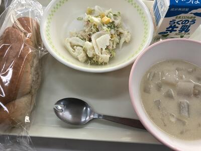 今日のメニューは、玄米パン、南関野菜の味噌シチュー、カリフラワーとツナのサラダ、いきなりだんご、牛乳です。