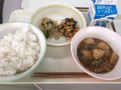 今日のメニューは、さといものそぼろ煮、ざぜん豆、白菜のおかかあえ、ごはん、牛乳です。