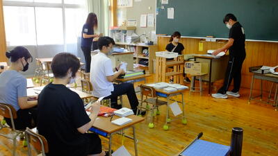 9月6日(火)は、台風11号接近のため県内の多くの学校が休校となりました。明日が休校と決定すると、雑巾かけを室内に入れ、物が散乱しないよう各学級で対応します。その中で、学校全体に目を向けて行動してくれた子供たちがいます。竹ぼうきや松葉かき、プランターなどを移動してくれました。ありがたいです。