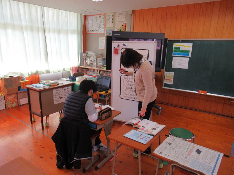 今日の3時間目の「むくのき学級(4年生)」では、算数の学習でした。「わり算の仕方」を一生懸命考え、解いていました。「ひばり学級(1・2・6年生)」では、6年生の社会の学習でした。(1~2年生はそれぞれ交流学級にて学習)「近代国家をめざして」の単元学習に取り組んでいました。「やまびこ学級(6年生)」でも、社会の授業中で、復習プリントに取り組んでいるところでした。それぞれの学級で、静かな環境で、集中して学習に取り組む姿が見られました。